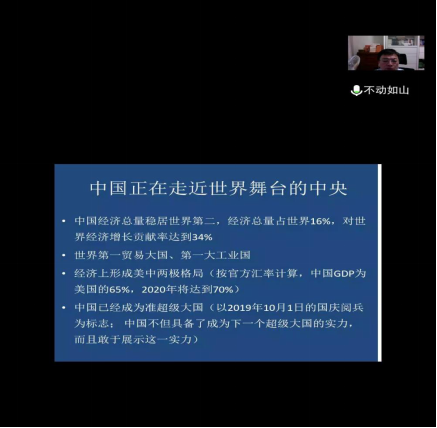 首先,胡教授对新冠疫情下的国际形势作出了判断,第一,当前全球正在经历百年未有之大变局、百年未有之大冲击;第二,中美关系处于滑坡状态;第三,世界经济持续萎缩;第四,各国针对中国的反中联盟正在发展;第五,中印边界问题、钓鱼岛问题等领土争端不断。