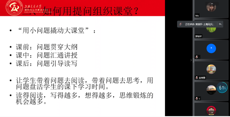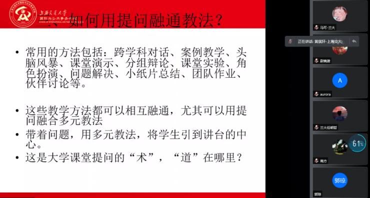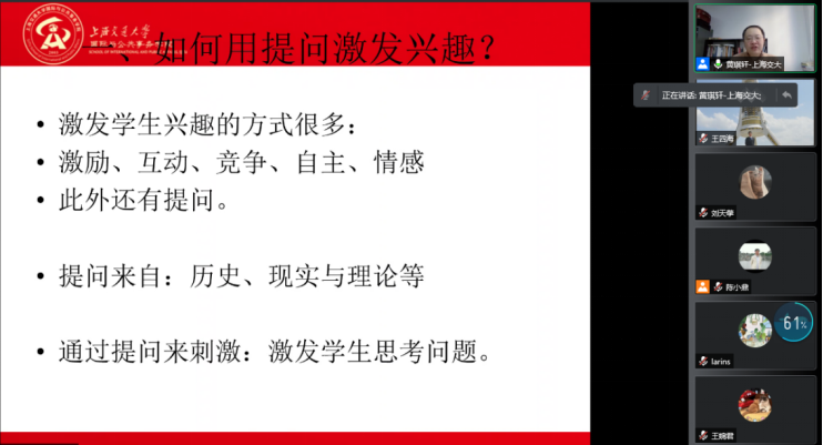 邀请,上海交通大学国际与公共事务学院国际关系系副主任黄琪轩教授为我院教师做了题为“以问题贯穿课堂:用提问激发兴趣”的线上讲座,副院长陈小鼎教授主持。