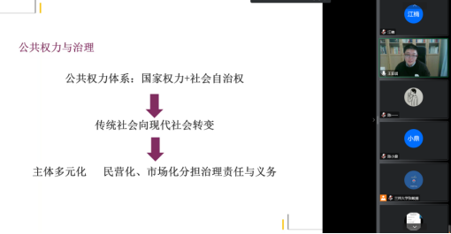 接着,王亚琪老师进一步分析了全球治理的底层逻辑,即在人类生活的公共领域如何建立秩序。王老师针对治理的概念和基本特征、公共权力与治理等内容进行讲解,其中王老师从历史发展的角度分析公共权力和社会空间的关系呈现倒U性结构,全球化的发展使主权国家在公共空间领域构建秩序的控制力下降。王老师分析全球化浪潮使现今全球化问题超越时空、超越代际,这些问题不仅需要国家间的条约加以约束和解决,还需要各种行为体秉持治理精神,参与正式、非正式的机制协调。
