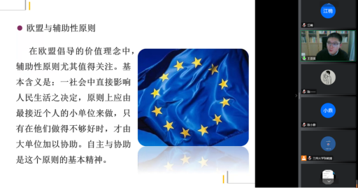 之后,王亚琪老师进一步讲解了联合国与人权观念是全球治理的价值来源,全球治理的动力是全球风险与全球共同意识,全球治理的成功和区域治理的有效性则通过欧盟与辅助原则来分析。王老师指出实现全球治理合法性和有效性的核心挑战是如何在多元行为体当中构建领导力,如何在分散的、正式与非正式机制以及统一的全球性机制之间做出抉择。