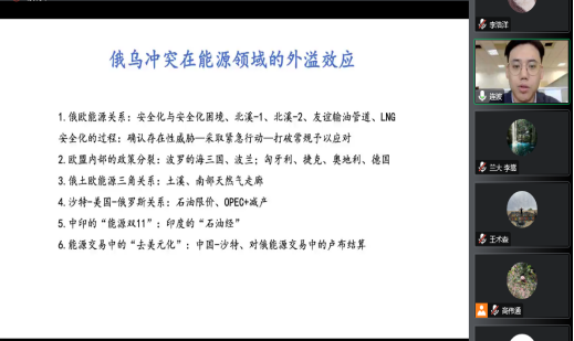 邀请,上海对外经贸大学讲师连波为我校师生做了题为《俄乌冲突背景下的国际能源治理》线上学术讲座。此次讲座由我院王术森老师主持,校内外300余名师生参加。