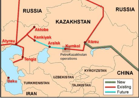 除了石油收益以外,中国与哈萨克斯坦建立的能源管道更具有地缘意义,这加速助推了中国与俄罗斯的管道修建。2002年,两国政府计划建立从哈萨克斯坦西部阿特劳(Atyrau)到中国新疆阿拉山口的管线。该项目实际上提高了哈萨克斯坦能源的自主性,进而减少了对俄罗斯的依赖。随着管道的竣工运行,哈萨克斯坦向中国出口的石油从2009年的600万吨增长到2013年的1230万吨,中石油还帮助哈萨克斯坦对希姆肯特(Shymkent)炼油厂进行了升级,使其年炼油量从1380万吨增长到1650万吨,确保了国内航空燃料不再依赖俄罗斯进口。更重要的是,中国-哈萨克斯坦石油管道刺激了中国-俄罗斯石油管道的建设。