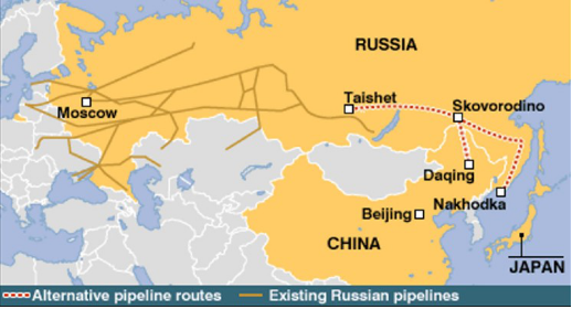 2003年1月,日本对俄罗斯管道运输公司的建议表示出兴趣,俄罗斯随后在2004年12月变更了计划,计划在泰舍特(Taishet)和纳霍德卡之间修建一条长约4130公里、年输油能力8000万吨的东西伯利亚-太平洋管道(Eastern Siberia-Pacific Ocean, ESPO),并在2005年宣布该项目将分两期实施,第一期工程从泰舍特到斯科沃罗基诺(Skovorodino),年输油量3000万吨,计划到2008年完成。但这期间中国与俄罗斯进行了漫长的谈判,直到2009年哈萨克斯坦-中国石油管道即将竣工三个月前,中俄双方才达成了价值250亿美元的石油换贷款协议。正是得益于中哈管道的修建,中国在与俄罗斯讨价还价时才获得了有利的位置,同时,借助上海合作组织框架下中俄战略互信的保障,中国与中亚各国的交往并没有激化中俄之间的地缘矛盾。
