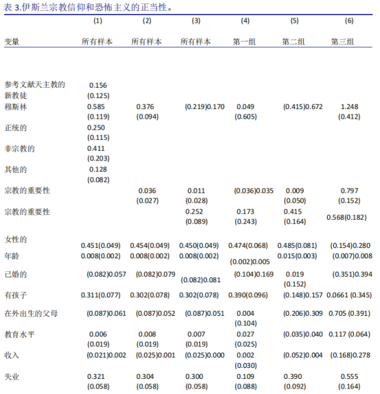 穆斯林更倾向于为恐怖主义辩护吗?为了解决这个问题,作者展示了六个模型来检验穆斯林和为政治暴力辩护之间的关系(表3)。