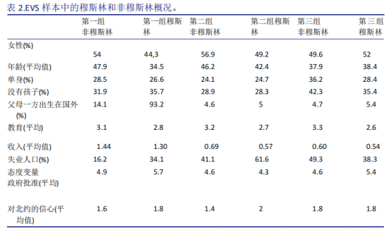 表2列出了穆斯林和非穆斯林受访者的描述性统计数据,分为三组国家:接纳少数有移民背景的穆斯林的国家(第1组);长期存在穆斯林少数民族的国家(第2组);最后是以穆斯林为主的国家(第3组)。这一分析表明,当穆斯林属于少数群体时,他们表现出的社会人口特征可能会增加他们为恐怖主义辩护的程度。