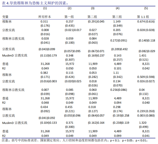 为什么穆斯林比其他宗教团体更容易为恐怖主义辩护?表4显示了H3和H4的统计检验结果,有以下5种模型。