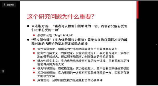 首先,杨原老师提出一个“反常识”的现象,即强国与弱国发生冲突和战争时,为什么弱国的获胜概率大于强国?在以往的国际政治研究中,“强权即公理“是绝大多数以国际冲突为解释对象的国际关系理论的基本假定或隐含前提。但在不对称冲突国家间,胜率的本质在于权力的对比,“实力优势即权力优势”这一推论是经不起推敲的。杨老师认为要突破“强权即公理”的研究盲点,从决心对比、选择效应的视角重新探讨不对称冲突的结果。