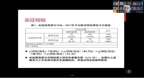 最后,通过一系列实证检验的验证基本假设,杨老师提出,“以弱胜强”是可能的、常态的。不仅如此,“弱权即公理”是结构性的,只要弱国不会因拒绝服从强国而丧失决策自主性(冲突的本质不是纯粹暴力),这一“法则”不会被打破。至此,本次讲座圆满结束。