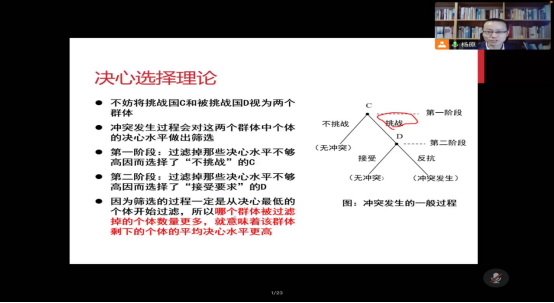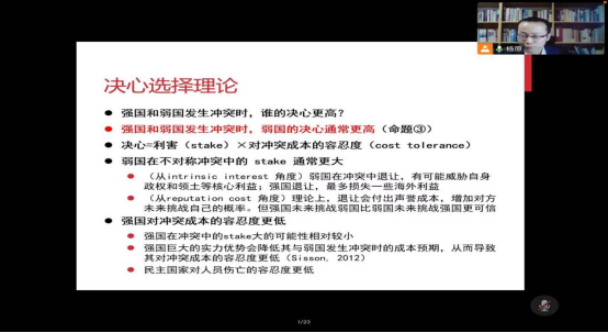 接着,杨老师引入决心选择理论来解释国家间暴力行为。其中决心这一主要概念被定义为:一国愿意为冲突支付成本的程度,也等同于利害与对冲突成本的容忍度。基于纯粹暴力和胁迫的分类,杨老师提出命题一:本质是胁迫的冲突中,决定冲突结果的核心因素是决心的对比。基于二战后战争史的回顾和总结,杨老师提出命题二:决定(二战后)绝大多数国际冲突和战争结果和性能的因素是双方的决心对比。基于对“决心”概念的定义,弱国往往在不对称冲突中利害更大,强国在不对称冲突中对冲突成本的容忍度更低。就此,杨老师归纳出命题三:强国和弱国发生冲突时,弱国的决心通常更高。基于以上命题,杨老师得出结论:二战后绝大多数不对称冲突中,弱国获胜的概率高于强国。