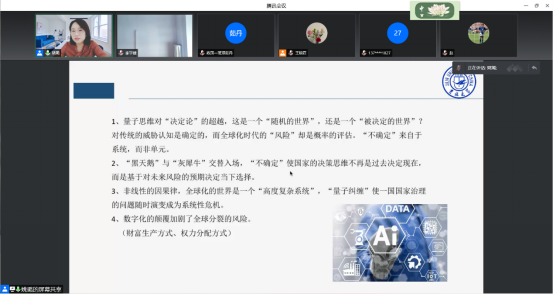 邀请,吉林大学行政学院教授,博士生导师姚璐围绕当前国际形势,并结合自身研究方向,为我院师生做题为“在‘不确定’的全球化中找回全球治理”的线上学术讲座。本次讲座由我院副院长陈小鼎教授主持,校内外三百余名师生参加。