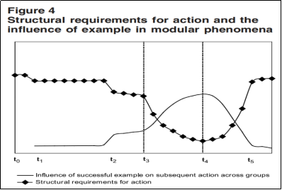 作者认为,模块化的“革命”与苏联时期民族主义的传播有着某些潜在的相似之处。具体来说体现在五个方面:1.模块化现象之所以成为可能,是因为这些案例之间有着共同的制度特征、历史、文化亲缘,这些因素是使得案例间产生了相互联系。2.模仿先前成功的经验是驱动模块化现象传播的基本机制,作者认为这与经济学中的“羊群效应”接近,并依赖于地理上的接近。3.不同情况下影响行为的案例权重遵循倾斜模型的模式,即就是随着时间的推移,成功案例影响的权重将会上升(如图1所示)。4.除了模仿以外,模块化行为还包括横向的积极努力。5.模块化进程的传播不是一个随机的过程,而是由某些事先存在的结构条件在空间和时间上形成的。