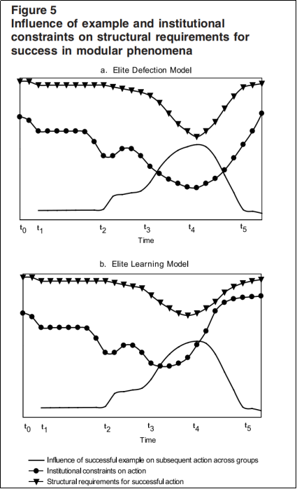 最后,模块化的变革对随后发生的事情有重大影响。由于它有能力取代在脱离其它情况的情况下采取的必要的结构要求,榜样的力量为福柯(Foucault)所说的“机会逆转”提供了可能性,即把不太可能发生所谓“革命”的国家变成看似不可避免的国家,不太可能发生的所谓“革命”变成似乎不可避免的“革命”,不太可能的所谓“民主化”变成似乎不可避免的“民主化”。