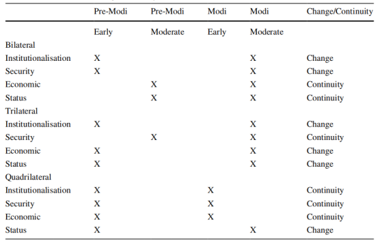 本文研究了印度的对日政策,旨在判断莫迪给印日战略伙伴关系所带来的变化程度。印度与日本处于一种嵌套的战略伙伴关系中:双边、三边(与美国)和四边(加上澳大利亚)。总体来看,在印度和日本战略伙伴关系的12个组成领域中,有6个领域发生了变化,6个领域保持了连续性(如表1所示),这表明莫迪对印日战略伙伴关系带来的变化程度不大。就类别而言,变化相当平均:制度化方面的两个、安全方面的一个、经济方面的一个和地位方面的两个。