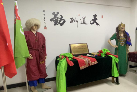 在张院长和SARYYEVA JAHAN引导下,我中心研究人员参观了兰交大国际教育学院文化走廊、中国文化体验室、绘画与书法室、土库曼斯坦文化研究所等。