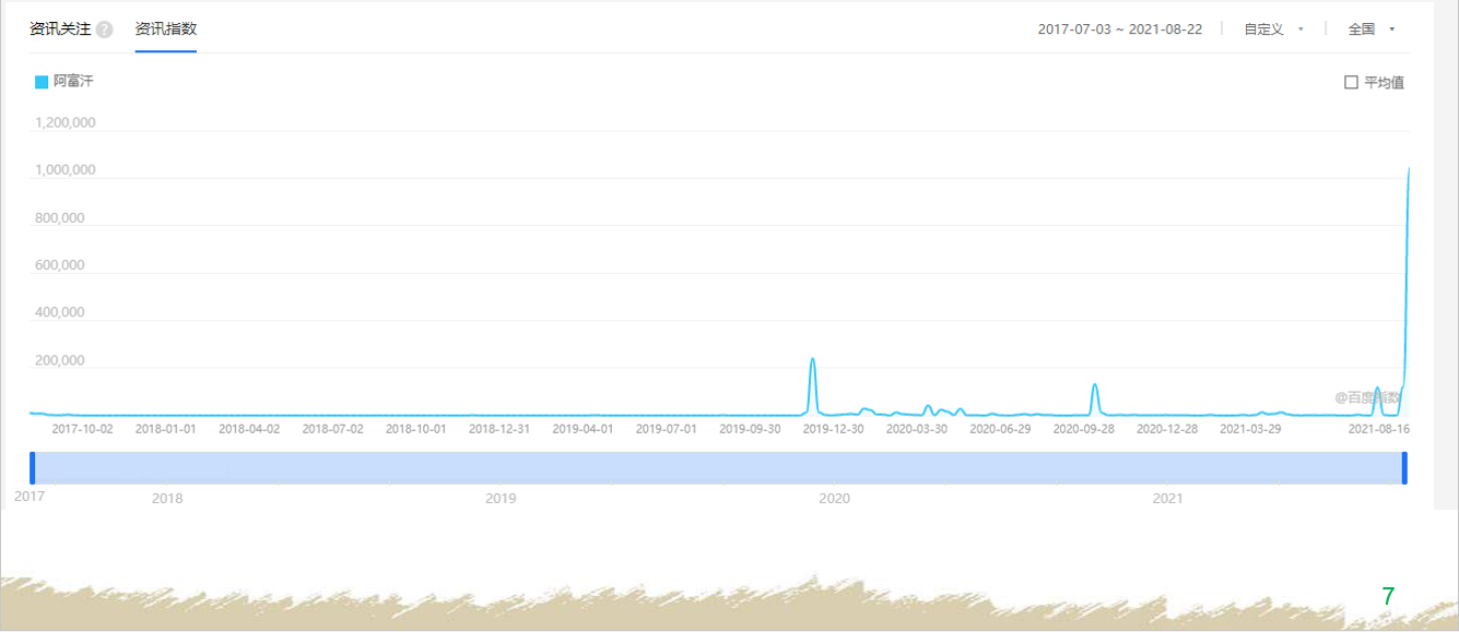 另外我做了一个百度指数还有谷歌指数趋势的一个对比。在百度指数里同时检索叙利亚、阿富汗和伊拉克这三个关键词,不同时期三个关键词的关注度是不太一样的,叙利亚排第一,整体的日均值和移动端的日均值都是处在第一位,阿富汗处在第二位,伊拉克处在第三位,时间的维度我选在了2011年到大前天(2021年8月21日)。这说明,我们对叙利亚问题的关注度远大于阿富汗。叙利亚离我们相对来说还是比较遥远,不像阿富汗是我们的一个邻国,但是大家对叙利亚的关注度,在过去一直比阿富汗高,只不过是最近这段时间阿富汗才引起了大家的注意,因为阿富汗局势出现了重大的变化。