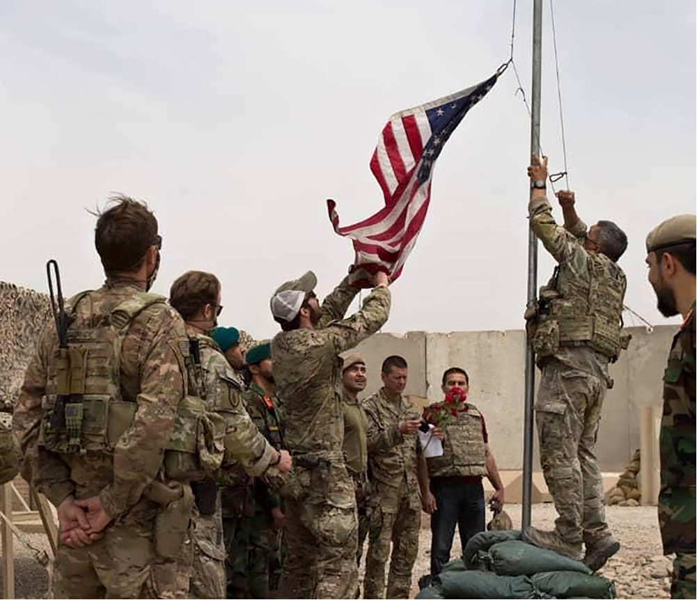 当地时间2021年5月2日,阿富汗南部赫尔曼德省安,美军正式将其在赫尔曼德省南部的新安东尼基地的控制权交给了阿富汗国民军,一面美国国旗被降下。 人民视觉 资料图