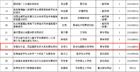 近日,甘肃省哲学社会科学规划办公室公布了2021年度甘肃省社科规划项目评审结果,孙秀文副教授所申报课题获甘肃省社科规划项目立项,课题名称为《中国与中亚、西亚国家友好关系发展史研究》。