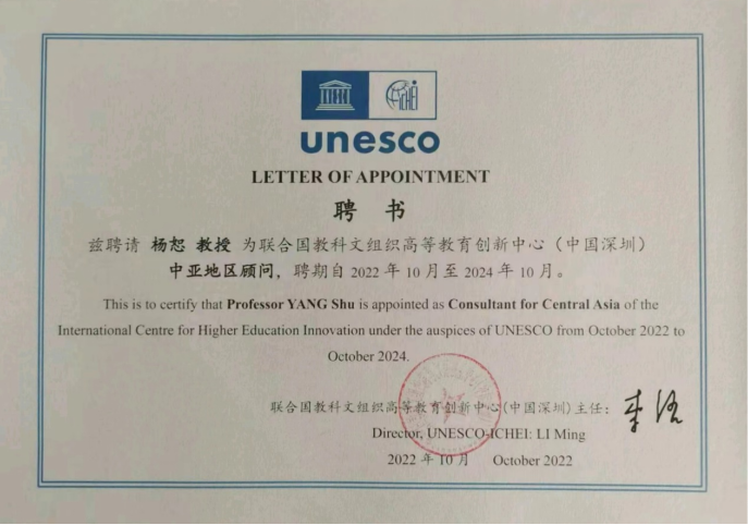 2022年10月,我院杨恕教授获聘联合国教科文组织高等教育创新中心(中国深圳)中亚地区顾问,聘期自2022年10月至2024年10月。
