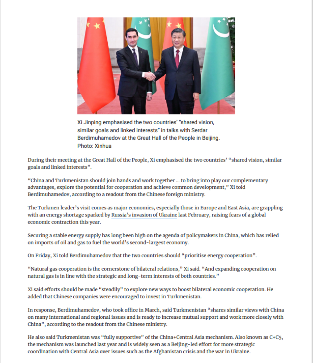 He also said Turkmenistan was “fully supportive” of the China+Central Asia mechanism. Also known as C+C5,the mechanism was launched last year and is widely seen as a Beijing-led effort for more strategiccoordination with Central Asia over issues such as the Afghanistan crisis and the war in Ukraine.
