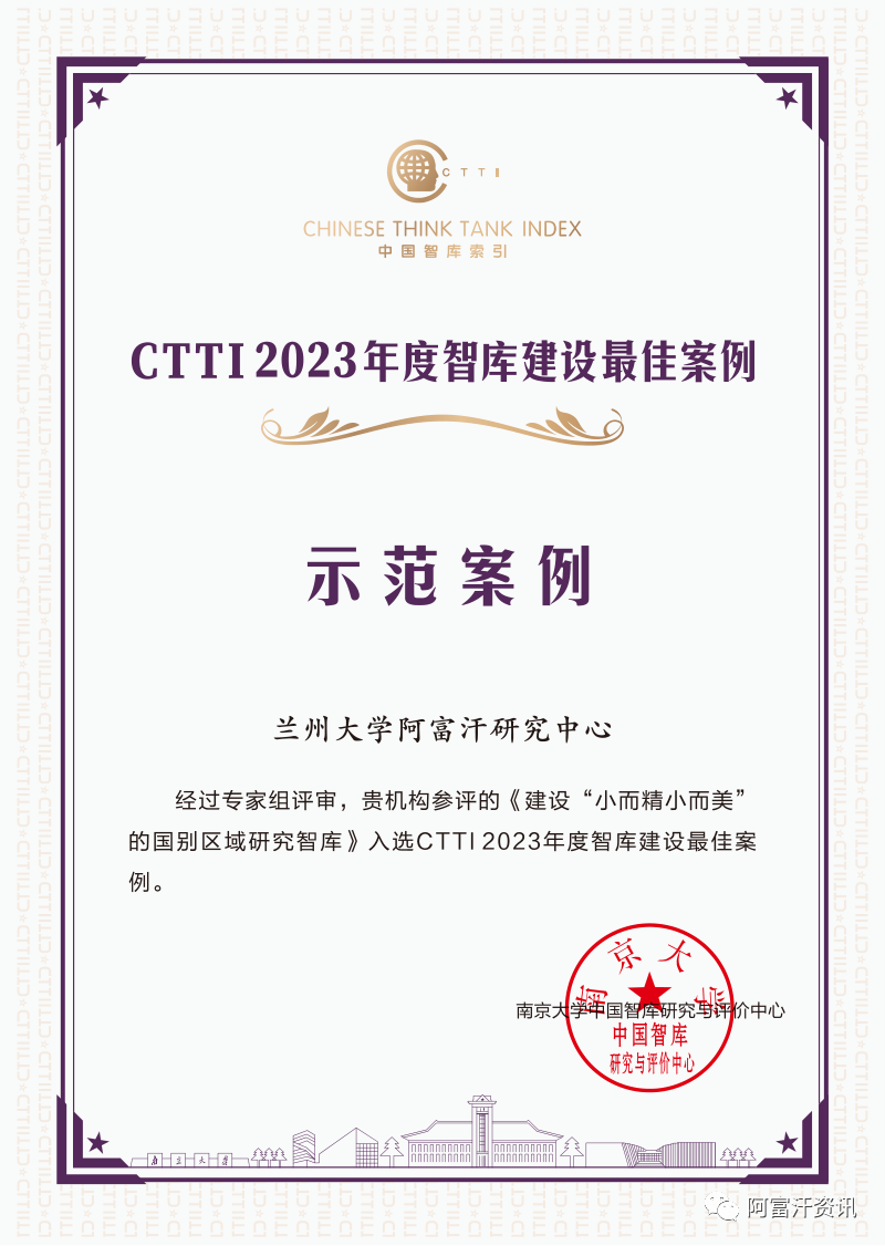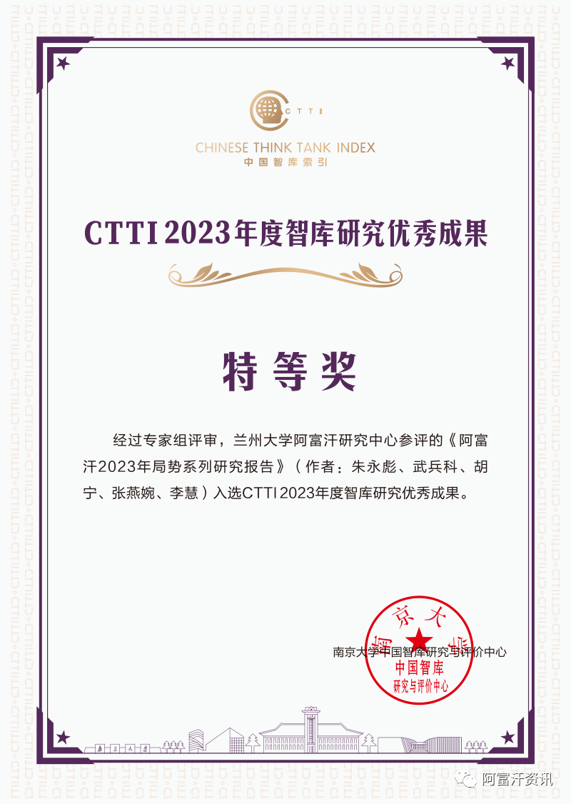 【喜讯】 51黑料 阿富汗研究中心荣获CTTI 2023年度智库建设“示范案例”和优秀成果“特等奖”