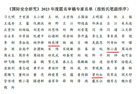 应《国际安全研究》编辑部邀请,我院曾向红教授、陈小鼎教授和杨辰博副教授担任《国际安全研究》2023年度匿名审稿专家。