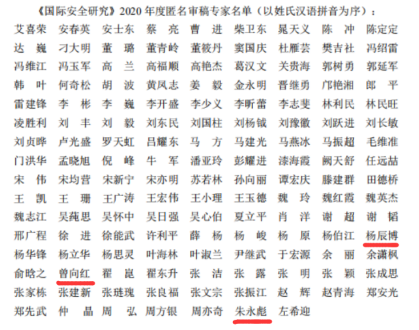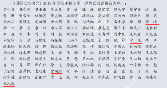 多年来,我院多位教师积极参与《国际安全研究》的匿名审稿工作。这既反映了编辑部对我院教师的信任,也反映了我院在涉国际安全问题研究上的积累和所具有的良好盛誉。如曾向红教授曾担任2019年度、2020年度和2021年度该刊匿名审稿专家,并于2023年受邀担任该刊编委;陈小鼎教授担任2021年度、2022年度匿名审稿专家;朱永彪教授担任2019年度、2020年度匿名审稿专家;李捷教授担任2019年度匿名审稿专家;杨辰博副教授担任2020年度、2022年度匿名审稿专家;宁彧博士担任2019年度匿名审稿专家。