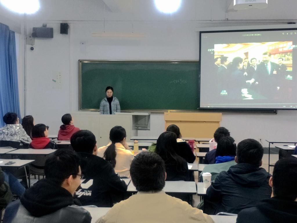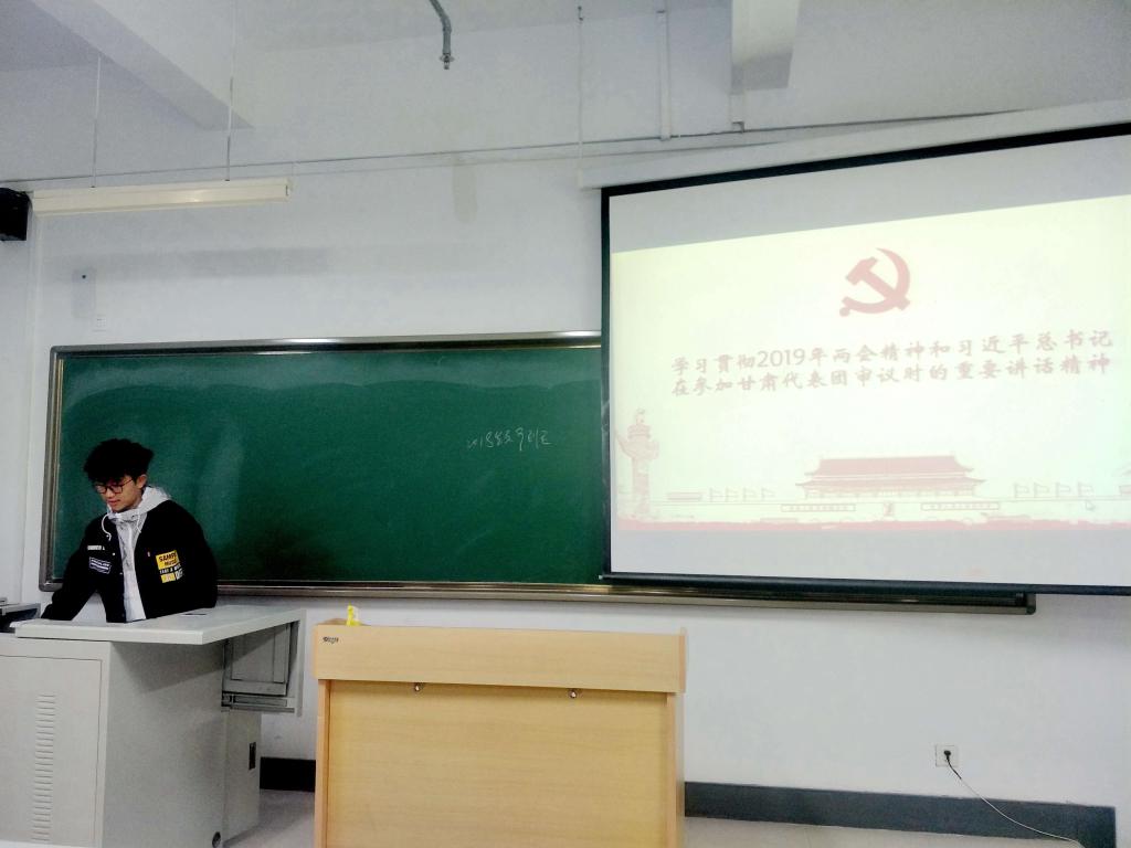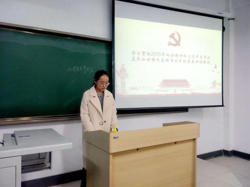 苏瑞洁向到场同志介绍本次组织生活会的目的意义及流程;第一小组组员张峻溯以PPT展示的形式分别对“2019年两会时代背景”、“2019年两会面面观”、“习近平总书记在甘肃代表团审议时的讲话”、“讲话的内涵及其意义”四个方面进行细致讲述;组员李兴通过视频演示方式,将国家在改善民生方面的重大成果以数据形式直观展现出来。最后,会议通过有趣的问答环节进一步巩固了两会中提及的相关政策知识,同志们积极参与,会议在大家的广泛学习与讨论中走向尾声。