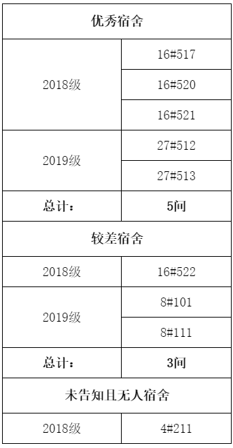 以上较差宿舍主要存在垃圾堆放多、清理不及时、床铺未整理、杂物较多、书桌不整洁、地面物品摆放不整齐等问题。请优秀宿舍继续保持,请较差宿舍主动整改,进一步提升宿舍环境。
