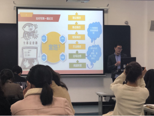 首先发言的是管理学院博士研究生王超同学。王超同学主要就论文写作及其发表与到会同学进行交流。王超同学系统梳理了论文写作的一般步骤:一是广泛进行文献阅读并确立研究领域;二是进行文献综述并确立研究方向;三是聚焦研究问题;四是进行研究设计。此外,他还强调了论文写作的一些注意事项,例如要坚持问题导向、注重写作规范性以及基本格式。同时,他梳理了科研过程中初学者可能会遇到的困难,并就如何应对给出了相应建议。