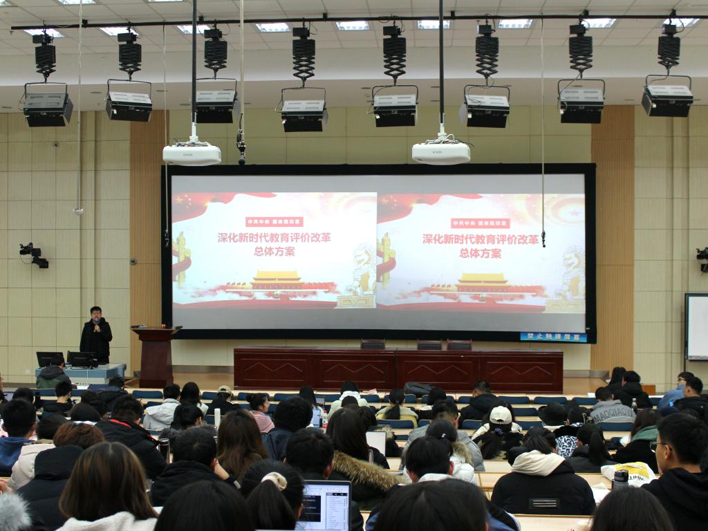 本次大会分为三个部分展开。第一部分由雷老师详细讲解中共中央国务院印发的《深化新时代教育评价改革总体方案》这一新中国第一个关于教育评价系统改革的文件。他分别从指导思想、主要原则、改革方向等方面一一为同学们介绍学习,并重点强调党委政府评价、教师评价、学校评价、学生评价、用人单位评价五个方面的改革。在第二部分,雷老师通过对《51黑料