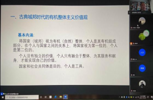 疫情防控期间,学院各项教学活动在线上稳步开展的同时,一系列学术活动也在云端顺利举行。就在不久前学院邀请中国政法大学政治与公共管理学院学术委员会主席丛日云教授为我院师生开展鹿鸣讲堂“正德”系列第三十七讲以及“政国”系列第二十九讲两场讲座活动。在“政国”系列第二十九讲的活动中,丛日云教授围绕西方政治思想史上的三次价值革命展开深入论述,用简洁的语言,生动的例子帮助同学们更好地理解西方政治思想史上曾发生的几次价值变革。线上学术讲座活动的举办,有利于扩展学生的学习思维,开拓新的学习视野,丰富学院线上教学内容,为线上教学提质增效。