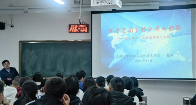 于11月26日下午16:30在榆中校区第二教学楼A404举办“‘立德树人·筑梦未来’第六届我最喜爱的十大教师”候选人曹伟老师见面会。曹伟老师发表“百年变局下的中国与世界——十九届六中全会精神学习心得”主旨演讲,我院2021级全体同学参加本次见面会。