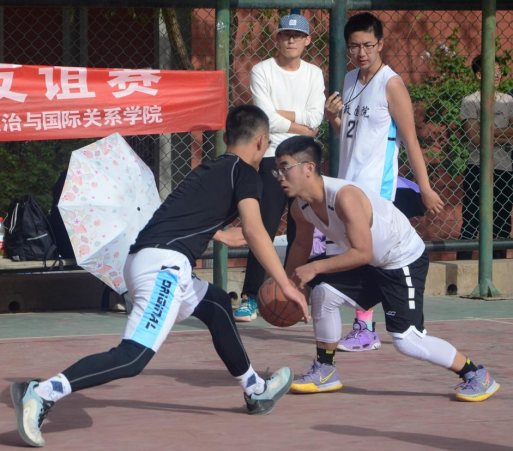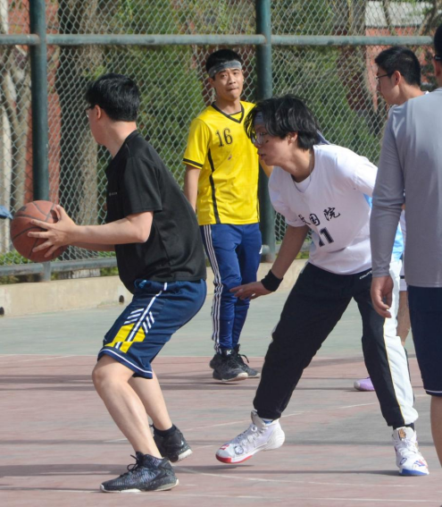 在短暂热身过后,双方队员各自就位。伴随着一声哨声,球被抛向空中,学生队刘一博与米老师同时高高跃起争夺球权,只见刘一博手一拨,学生队率先拿到球权发起进攻。上半场时间内,学生队受到老师们的压制,得分暂时落后于老师队伍,但他们并没有因此气馁,在中场休息时及时调整战术。下半场开始,学生队伍的快速反攻,高密度防守让得分差距慢慢缩小,老师队伍得分不再那么轻松,双方打得有来有回,比赛呈胶着状态,战况激烈。比赛进行到最后一分钟,比赛双方仍然积极防守和进攻。最终,学生队伍惜败老师队伍。赛后,老师们为学生队传授自己多年的篮球经验,同学们积极吸取经验,相信在老师们的经验分享与日常刻苦的训练后,我院篮球队将会一步步增强实力,在日后的比赛中所向披靡,势不可挡。