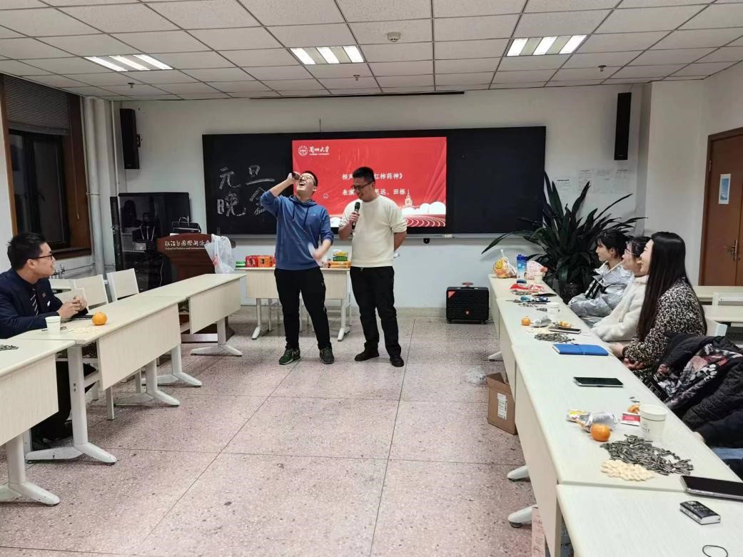 研究生会成员们的新年祝福中拉开序幕,大家的欢声笑语瞬间点燃了现场的热闹氛围。贺建潇同学用美妙的歌声为晚会拉开了帷幕,他优美的嗓音将歌曲演唱的意境表达得淋漓尽致。现场观众也不自觉地随之打起节奏来,气氛相当热烈。随后,刘思远和田栋同学也带来了精彩的相声作品,其搞笑的情节与生动的表演使现场观众掌声不断,晚会一次次被推向高潮。不仅如此,晚会中还穿插了精心准备的抽奖和游戏环节,“套圈”、“抢凳子”、“击鼓传花”等众多精彩欢乐的游戏极大地调动了同学们的积极性,进一步拉近了研会成员之间的距离,使在座每一位同学都感受到了研究生会大家庭的温暖。两个半小时后,晚会顺利地落下了帷幕。