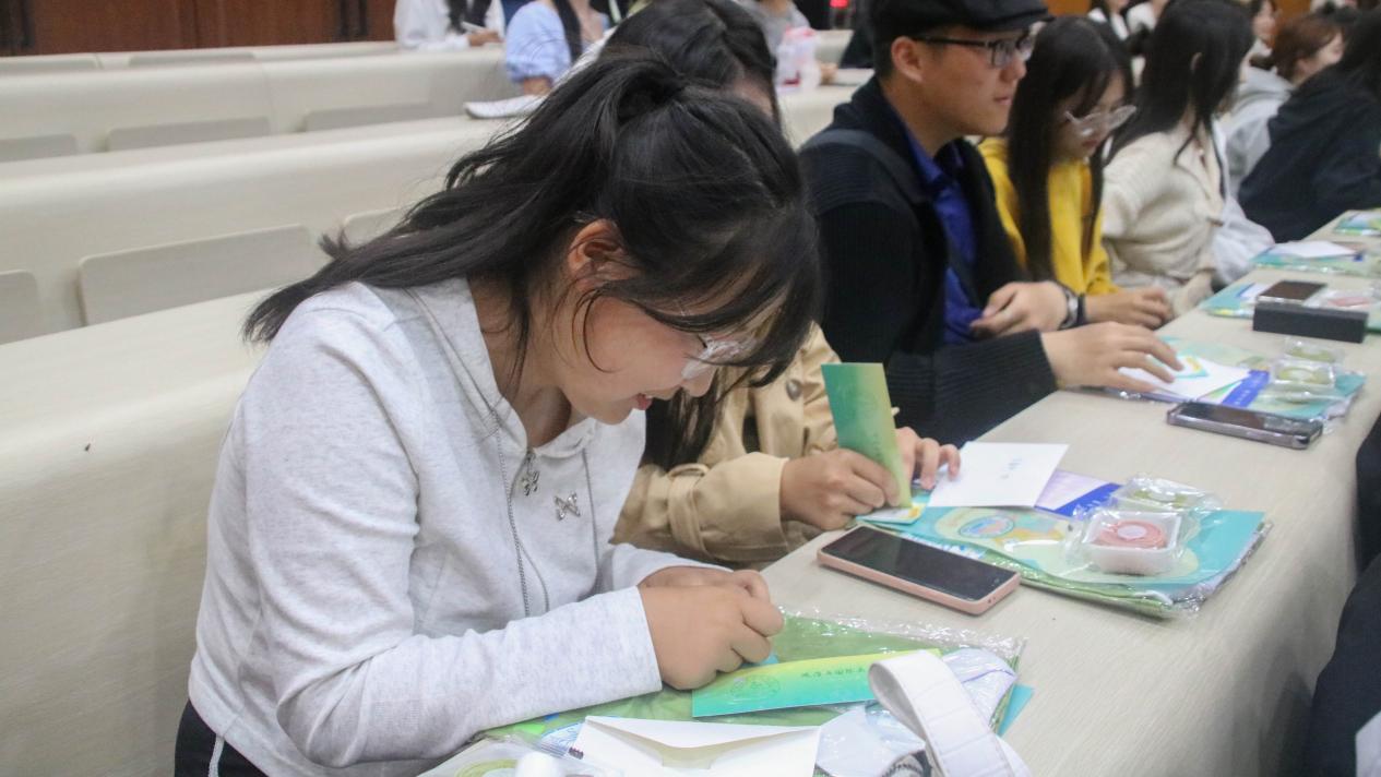 大会第四项,进行“幸运刮刮乐”活动,由2022级国际政治班梁嘉伟同学主持。此时,每位新生的座位上,都摆放着一封由高年级学长学姐亲手书写的新生寄语,以及一份由学院团委宣传部定制的刮刮卡。在此游戏环节中,共有四位同学荣获一等奖,收获了学院准备的精美礼品,并阐述自己对兰大和政国院的印象。参与此环节的其他同学也都获得了参与奖,他们纷纷举手参与问题互动,现场气氛热烈而温馨。