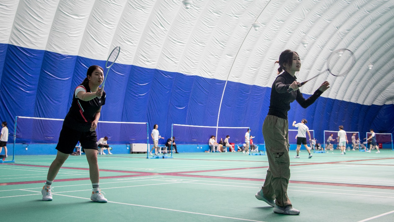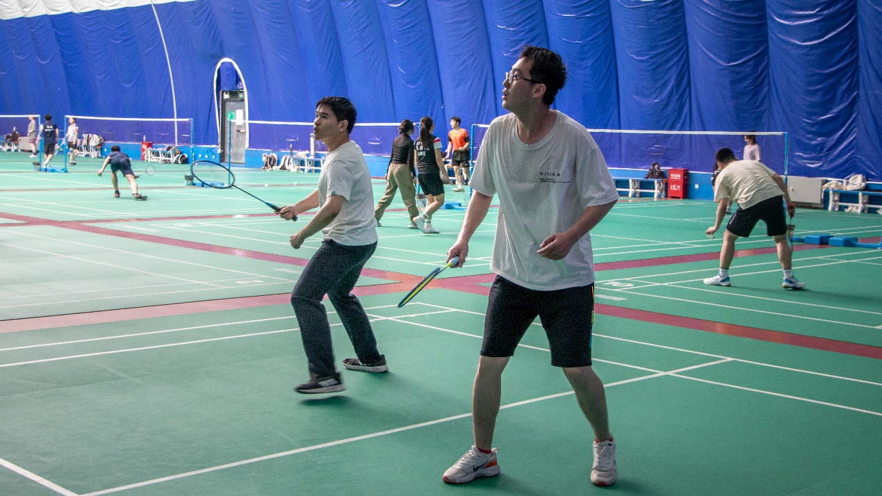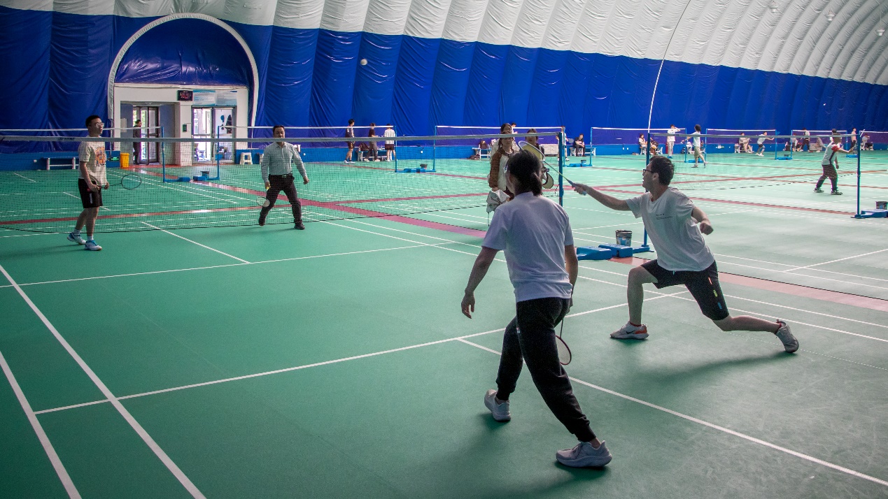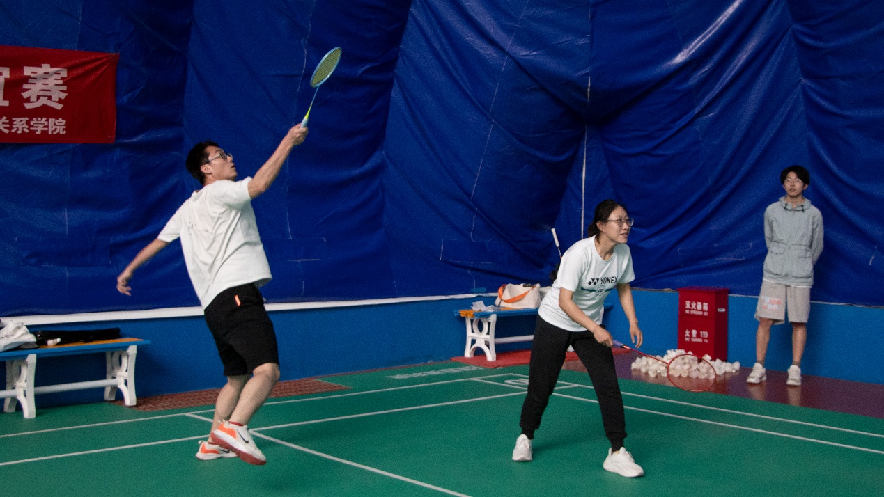 随着裁判一声令下,现场气氛瞬间被点燃,羽毛球活动正式拉开帷幕。双方迅速进入状态,展开一场激烈的较量。羽毛球在空中划过一道道优美的弧线、选手们跳跃扣杀时干净利落的动作,球拍快速挥动发出悦耳的声音,呈现了一场视觉和听觉的双重盛宴。同学们活力青春的步伐和老师们稳健有力的动作形成强烈碰撞,双方实力平分秋色,引得在场观众掀起一阵又一阵惊叹。活动进行到后半段,尽管呼吸急促、体力消耗、衣服被汗水浸透,但大家仍然沉浸在激昂欢乐的气氛当中。在现场氛围的感染下,场下的观众也纷纷加入到活动中,师生间充满欢声笑语,羽毛球馆内洋溢着欢乐的氛围。