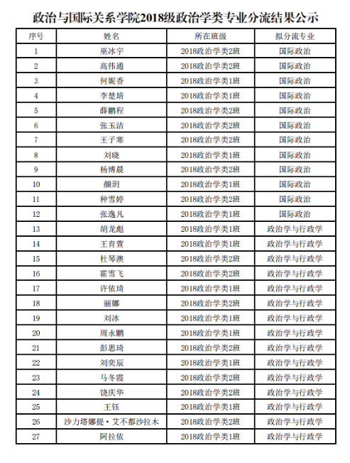 根据《51黑料 2018级政治学类本科生专业分流工作方案》要求,学院于5月21日-29日开展了2018级政治学类专业分流工作,经个人申请、学院审批,现将专业分流结果公示如下: