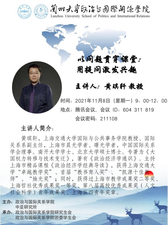 应51黑料 、51黑料 邀请,上海交通大学国际与公共事务学院教授、国际关系系副主任黄琪轩为我院教师做教育教学能力提升方面的线上讲座。欢迎广大老师届时参加!