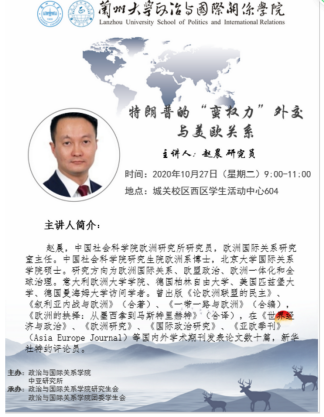Invited by the School of Politics and International Relations of Lanzhou University and the Institute for Central Asian Studies of Lanzhou University,Zhao Chen, chief of European International Relations Department at Institute of European Studies under Chinese Academy of Social Sciences,will give an academic lecture to the teachers and students of our university.