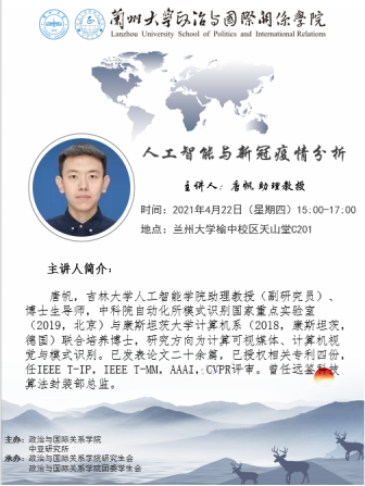 Invited by the School of Politics and International Relations of Lanzhou University and the Institute for Central Asian Studies, Dr.Tang Fan, assistant professor of School of Artificial Intelligence of Jilin University, will give an academic lecture for the teachers and students of our school. All teachers and students are welcome to attend.