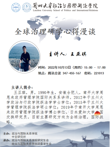 At the invitation of the School of Politics and International Relations of Lanzhou University and the Institute for Central Asian Studies of Lanzhou University, lecturer Wang Yaqi from the Zhou Enlai School of Government, Nankai University will give an online academic lecture. All the teachers and students are welcome to attend.