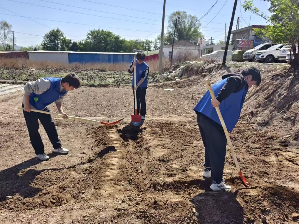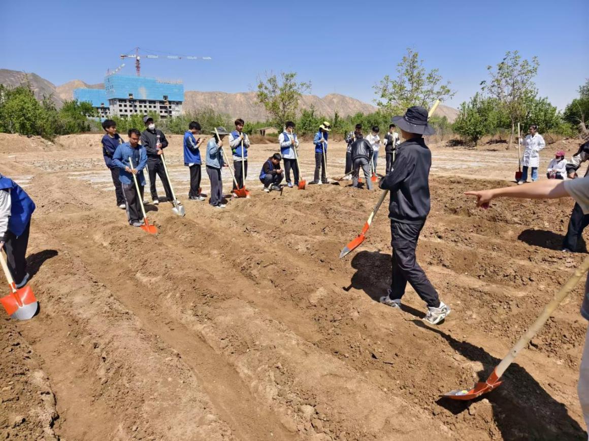 榆中校区干旱楼前已是一派热火朝天的景象,我院8名志愿者身着蓝色志愿者马甲,手持农具,在专业教师指导下上着一堂别开生面的农耕实践课程。